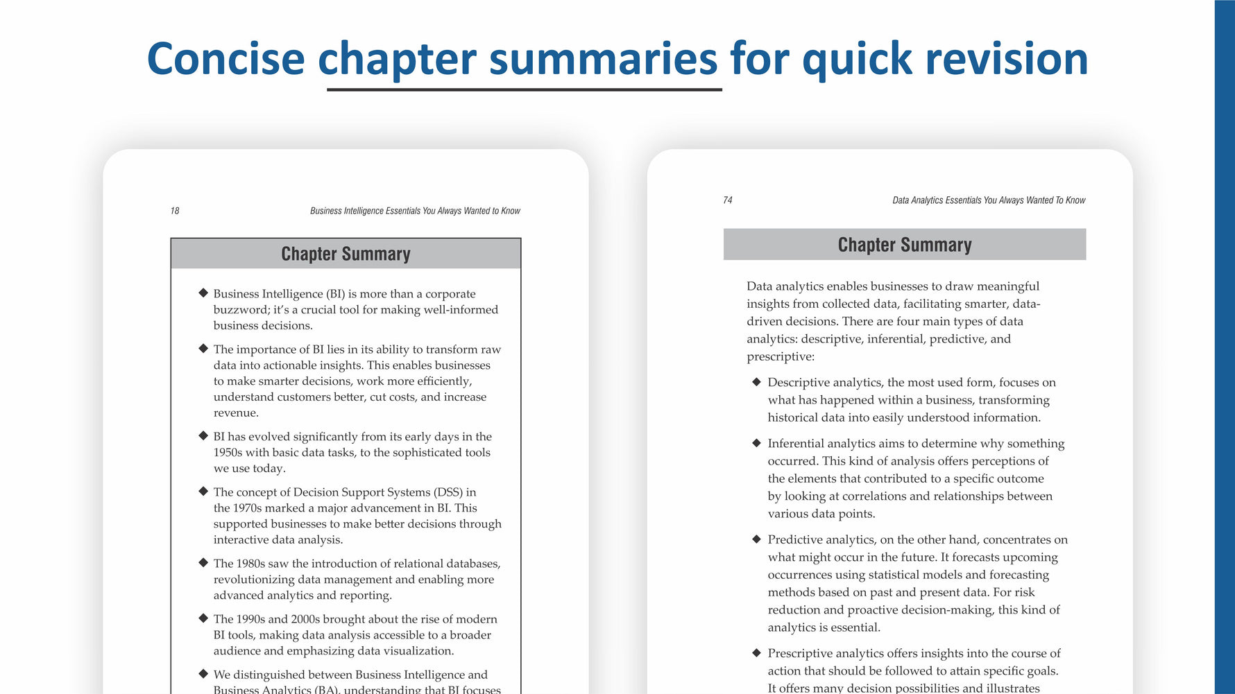 These books helped me understand how analytics shapes business decisions. The diagrams and summaries are very effective. Its ideal for anyone looking to build a career in data or BI.