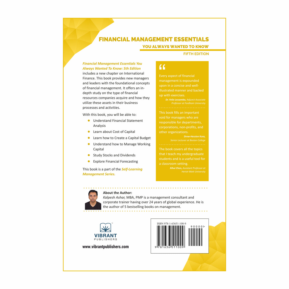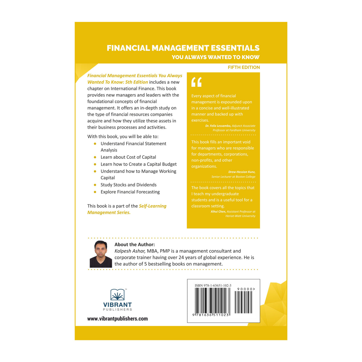 Financial Management Essentials is an essential guide to making good financial management decisions! Financial Management Essentials You Always Wanted To Know: 5th Edition provides new managers and leaders with the foundational concepts of financial management. This new and updated edition comes with an exciting new chapter on international finance, including case studies and practical examples. It offers an in-depth study on the type of financial resources companies acquire and how they utilize these assets in their business processes and activities. Each chapter provides real-world examples of financial management practices and includes practice exercises to help train the reader in the usage of these critical tools.