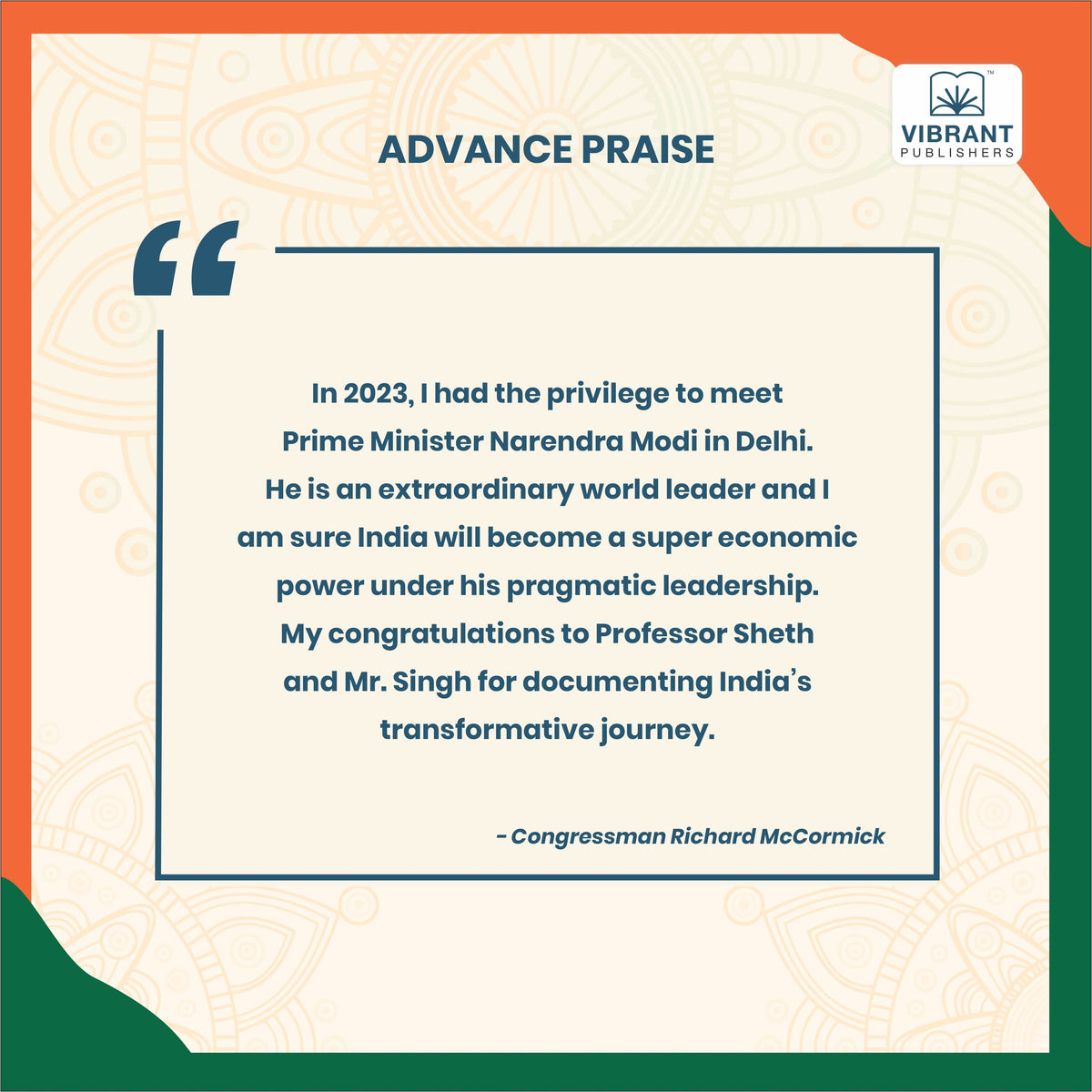 In 2023, I had the privilege to meet Prime Minister Narendra Modi in Delhi. He is an extraordinary world leader and I am sure India will become a super economic power under his pragmatic leadership. My congratulations to Professor Sheth and Mr. Singh for documenting India’s transformative journey
