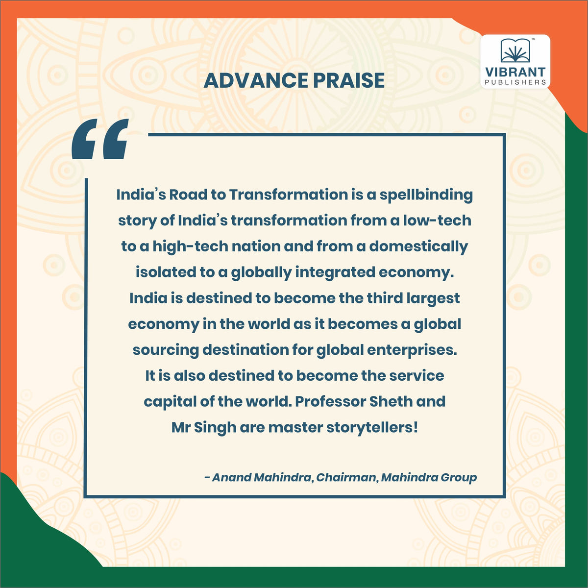 “India’s Road to Transformation is a spellbinding story of India’s transformation from a low-tech to a high-tech nation and from a domestically isolated to a globally integrated economy. India is destined to become the third largest economy in the world as it becomes a global sourcing destination for global enterprises. It is also destined to become the service capital of the world. Professor Sheth and Mr Singh are master storytellers!”