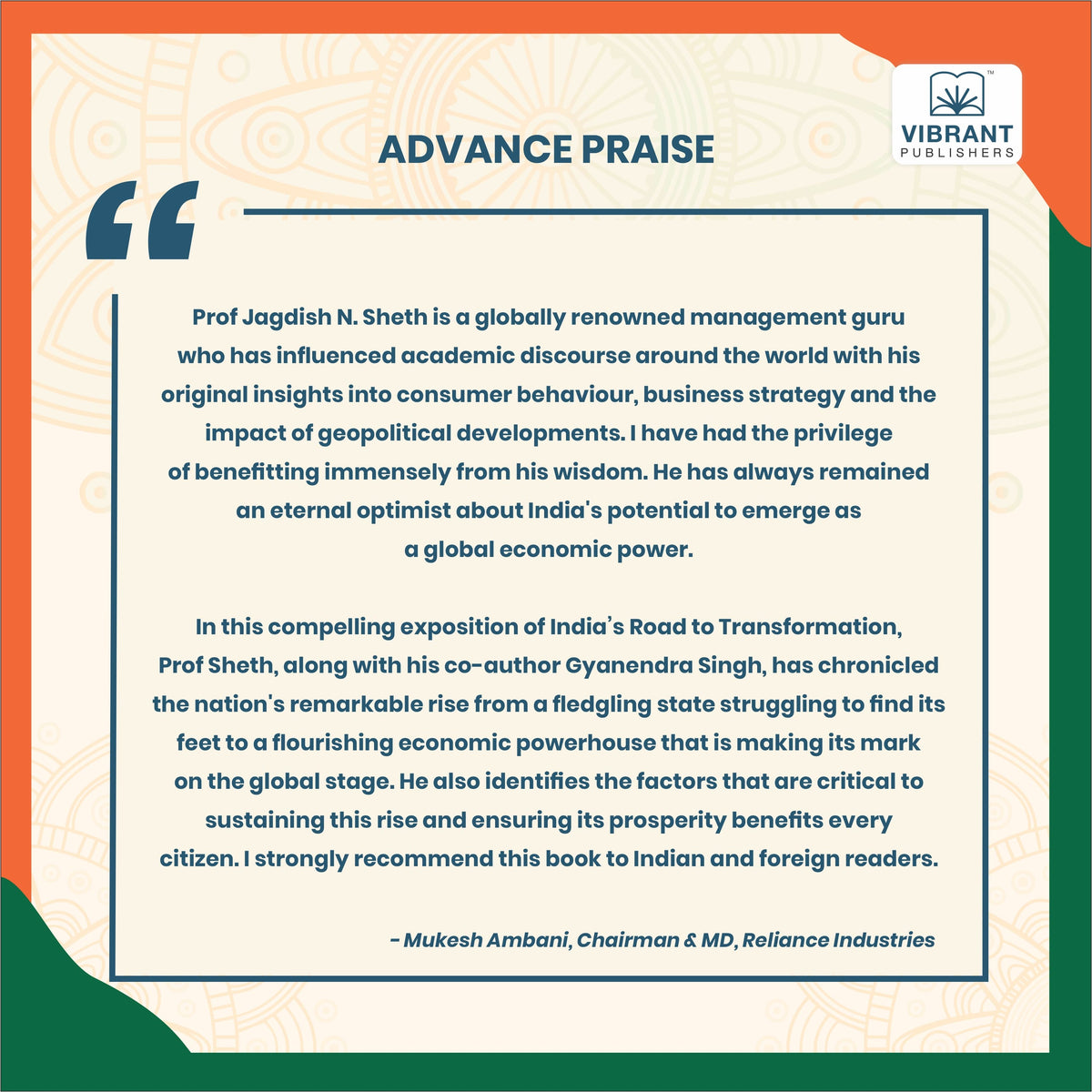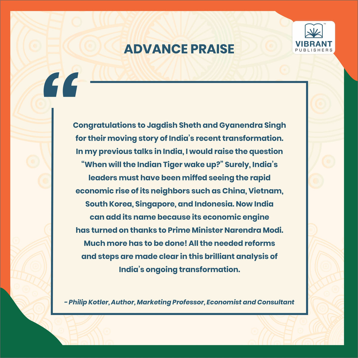 I congratulate my mentor, professor Jagdish Sheth and his colleague (late Gyanendra Singh ) for a very captivating story of rise of India in front of our eyes. As the book documents, what matters most in transforming a nation is the leadership.