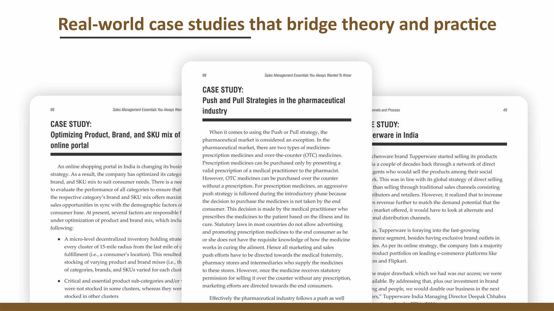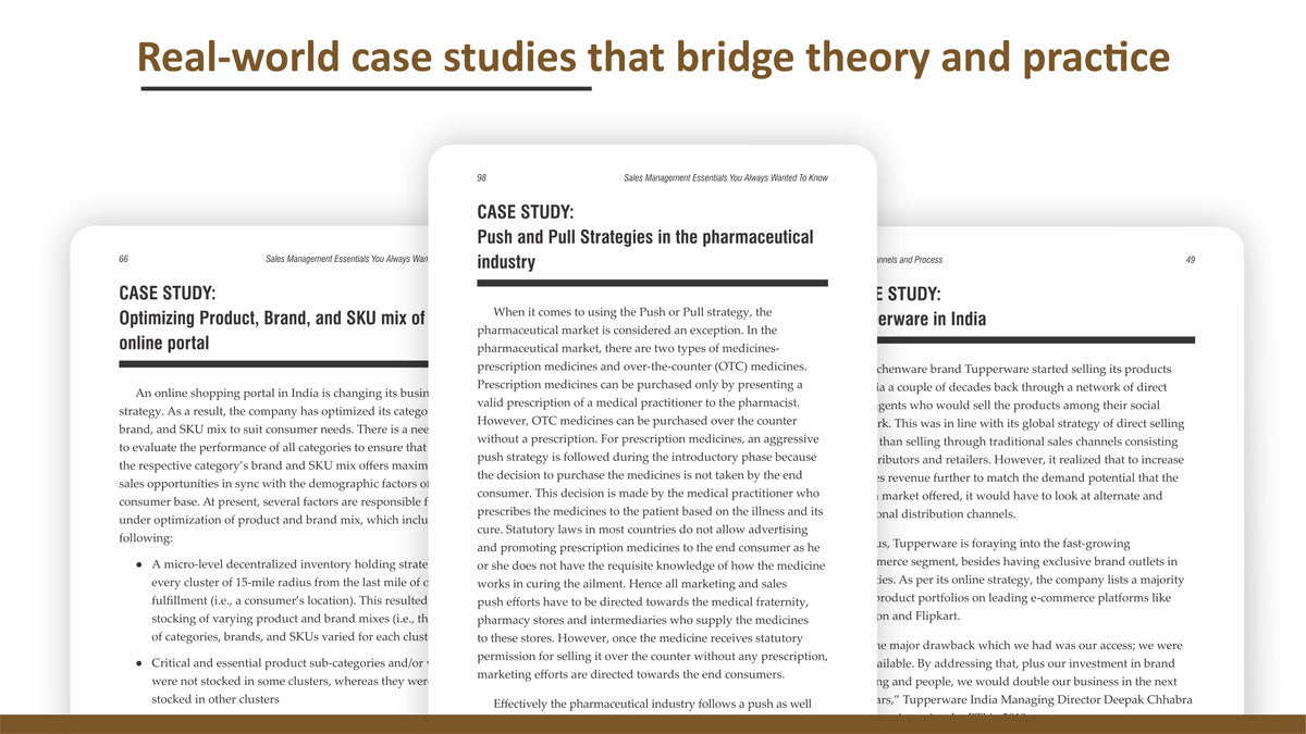 The book provides a bottom-up approach so that the reader gets a clear and concise understanding of the concepts in sales management, including real-world concerns and needs of customers as well as the sales management team (marketing, sales, distribution, intermediaries, etc).