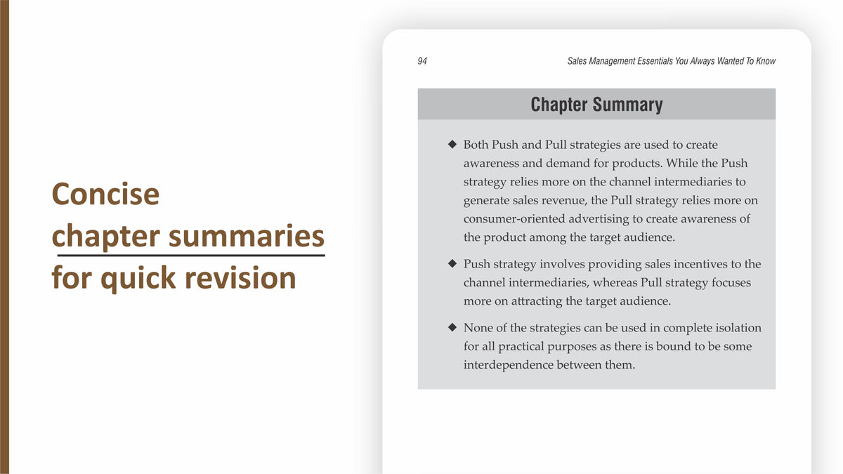 This book is an easy-to-implement learner's guide to understand sales in the dynamic context of business. The best thing about the book is its lucid language, conceptual clarity, and seamless flow, with value additions in the form of chapter summary, assignments, quizzes, and case-studies, which make it an invaluable treasure.