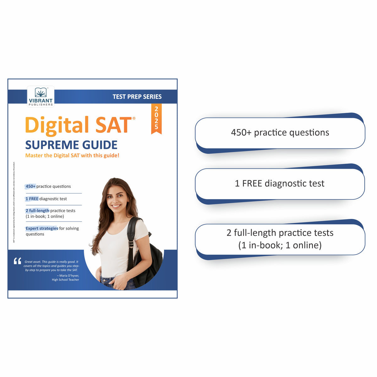 To get more practice for the Digital SAT, consider Digital SAT Reading and Writing Practice Questions and Digital SAT Math Practice Questions by Vibrant Publishers. For full-length tests, consider Practice Tests for the Digital SAT, and for a simulated practice of the test, prepare with adaptive Online Practice Tests for the Digital SAT.