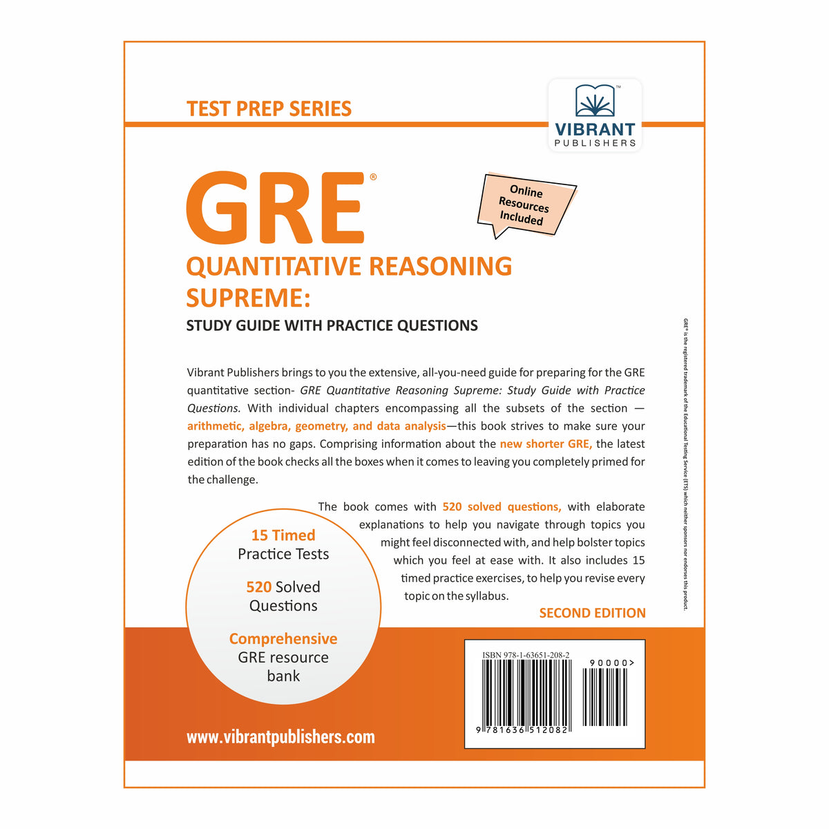 Vibrant Publishers brings to you the all-you-need guide for preparing for the GRE quantitative section- GRE Quantitative Reasoning Supreme: Study Guide with Practice Questions. With individual chapters encompassing all the subsets of the section—arithmetic, algebra, geometry, and data analysis—this book strives to make sure your preparation has no gaps. Comprising information about the new shorter GRE, the latest edition of the book checks all the boxes when it comes to leaving you completely primed for the challenge.