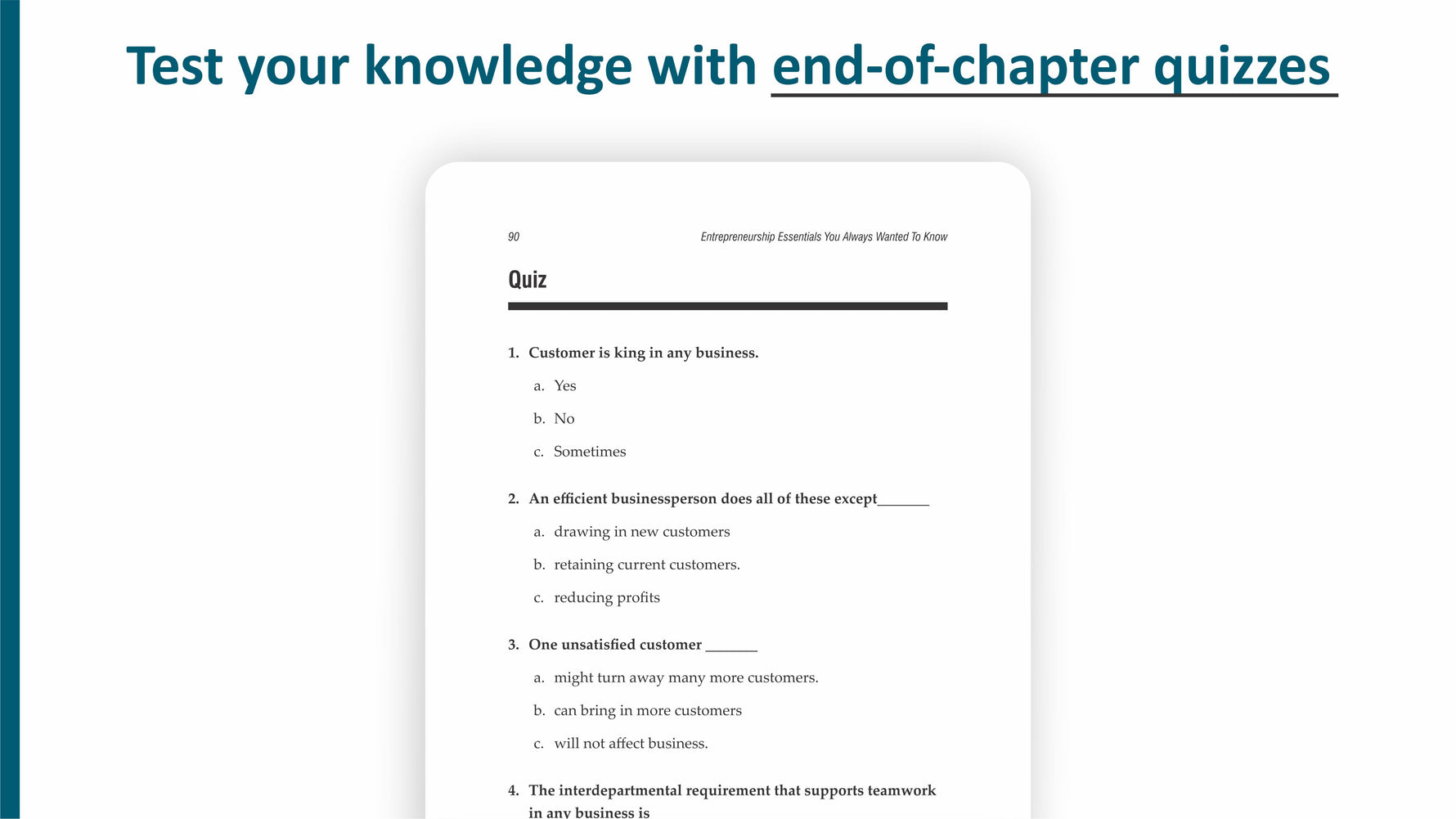 Dipping your legs in the sea of competitive businesses and experienced business owners can look daunting. But, if you build a strong foundation for your business and yourself, you can also become a successful entrepreneur. Entrepreneurship Essentials is a primer for people looking to try their hands at entrepreneurship. It talks about what it takes to be a successful business owner and the challenges that arise in the path and provides all the necessary answers to the questions you may have about how to create, manage, and direct a business to profitability.