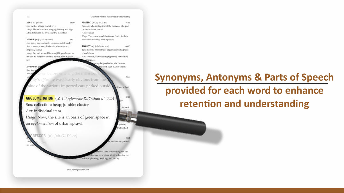GRE Master Wordlist: 1535 Words for Verbal Mastery by Vibrant Publishers is a handy manual for all those readers who are preparing for their GRE exam and need to master the GRE vocabulary. The book has 1535 essential words, an easy pronunciation guide, synonyms and antonyms, parts of speech, sample sentences, and a definitive guide to essential vocabulary for GRE. This manual is a good tool to master the new GRE vocabulary in a reasonably short span of time and will help the GRE aspirants to get a good score. This book has everything in it that will make the GRE aspirants ace their verbal mastery test without much difficulty.