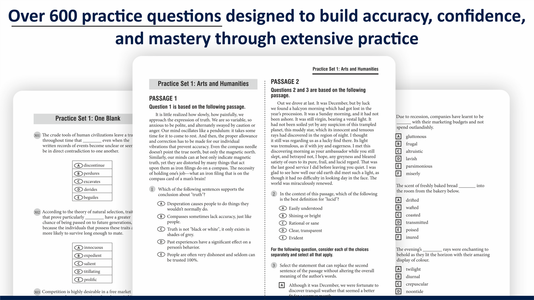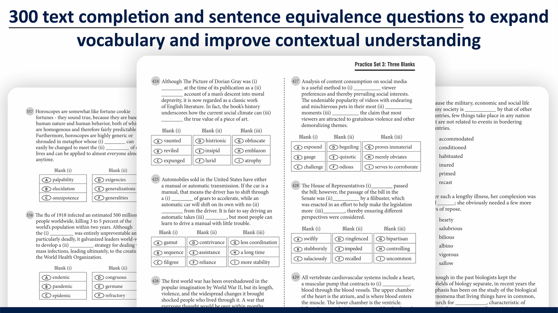 - 150 Text Completion and Sentence Equivalence Questions – Focused practice to strengthen key question types.