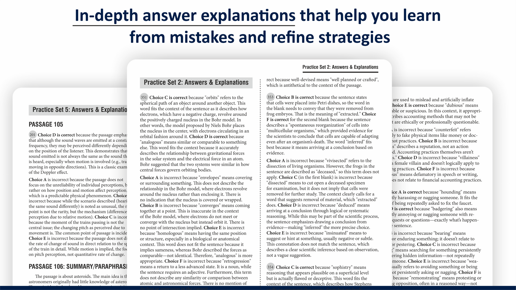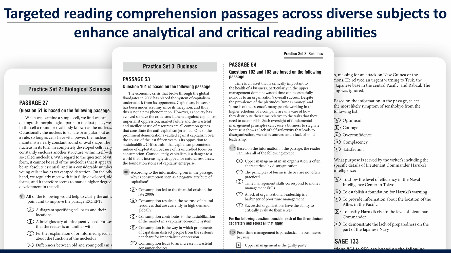 - Targeted Reading Comprehension Topics – Practice questions include various subjects, such as physical sciences, biology, social sciences, everyday topics, business, and arts and humanities.